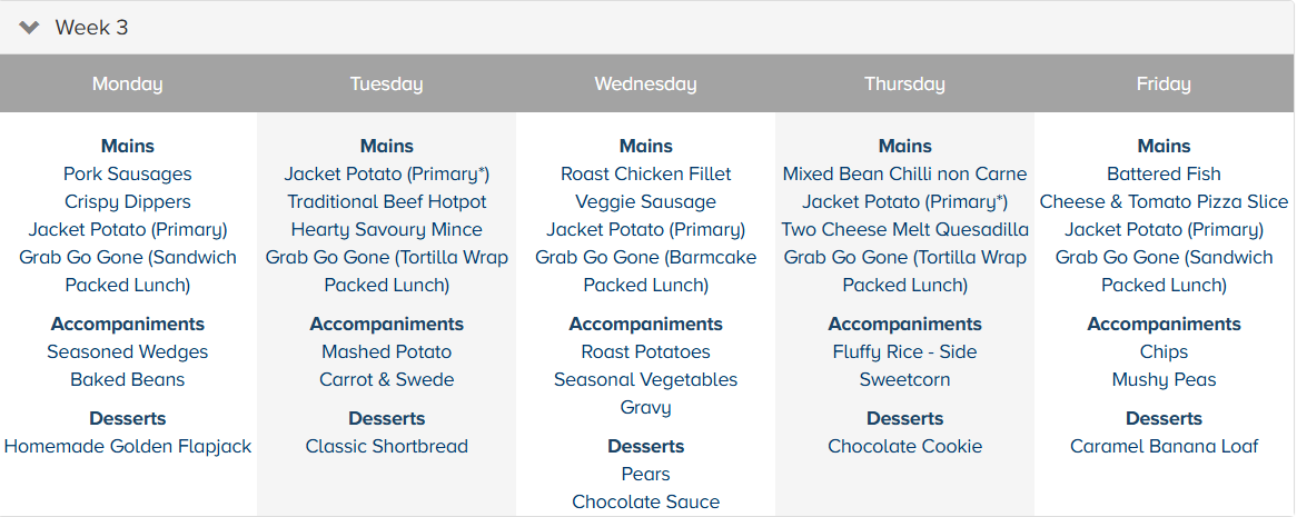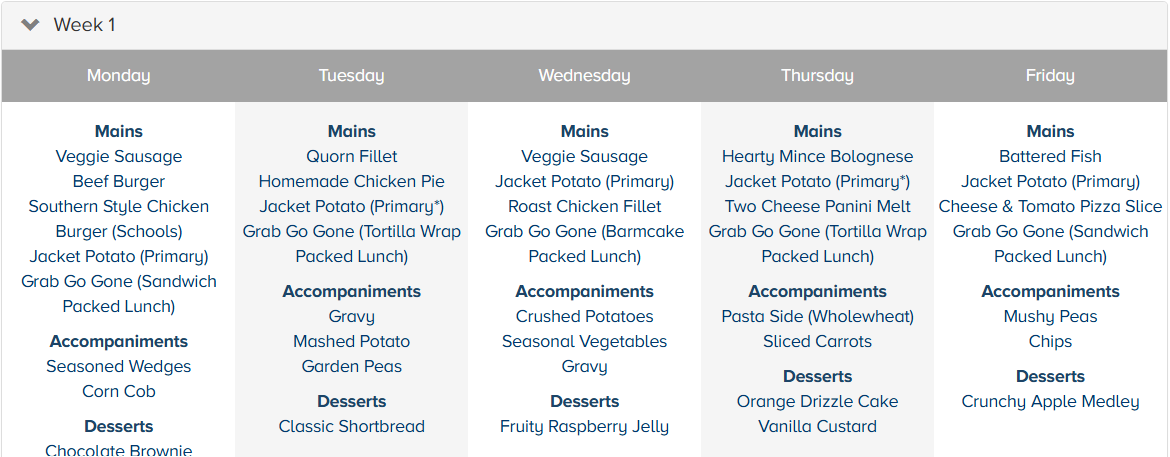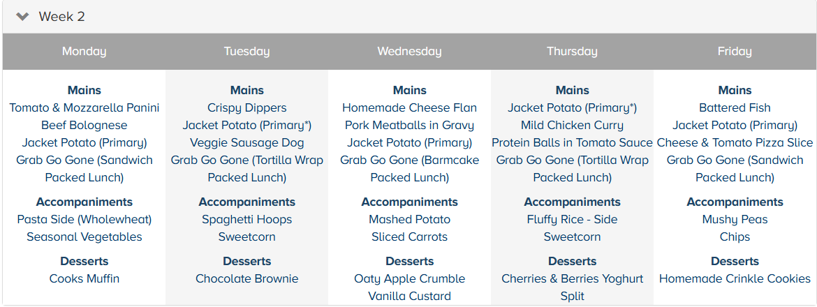 A school lunch is available with a choice of menu at the current price of £15.50 per week (£3.10 per day). Parents and children can log onto School Grid and choose their meal option for the day/week. Moneys are payable via School Grid.